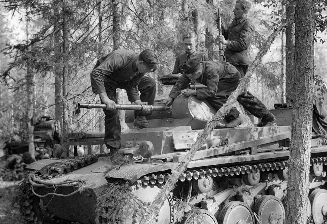 The crew of a PzKpfw II (Panzerkampfwagen II) carefully removes the small-caliber barrel for cleaning—a critical task to ensure the tank’s battlefield readiness. This historic image captures the Panzer-Abteilung z.b.V. 40 unit stationed in Raatevaara, Finland, on June 27, 1941, during the early days of Operation Barbarossa.