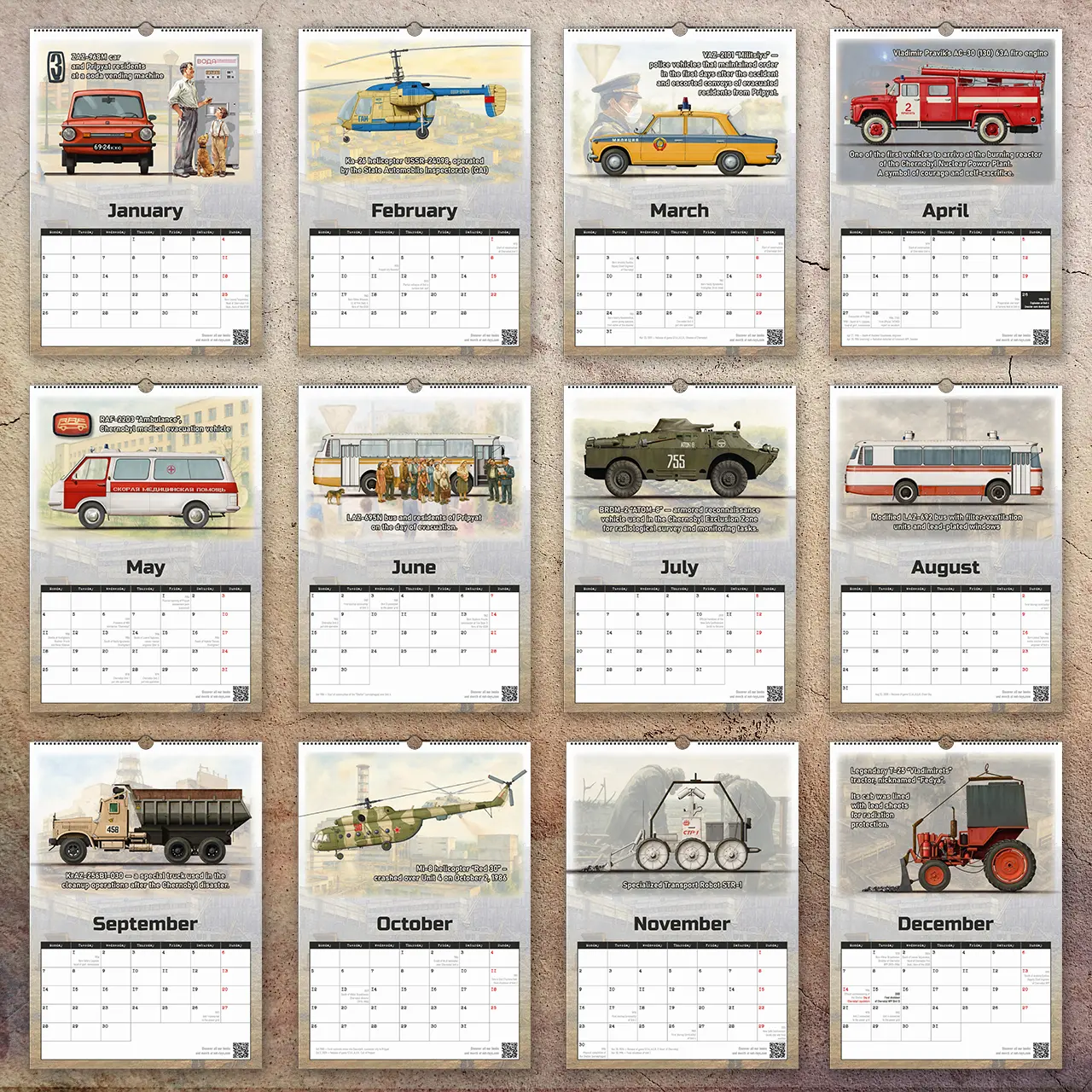 A unique 2026 wall calendar dedicated to the machines and people who fought the invisible enemy at Chernobyl. Twelve exclusive artworks by Igor Donchik and Deniss Ignatjev capture the vehicles that took part in the disaster cleanup — from fire engines and police cars to helicopters and armored units.