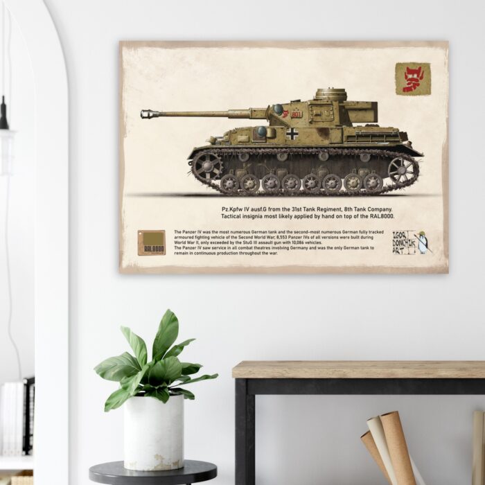 Introducing our exclusive classic poster featuring an awesome color profile of the Pz.Kpfw IV ausf.G from the 31st Tank Regiment, 8th Tank Company – a captivating piece of World War 2 history that will undoubtedly elevate the aesthetic of your home or office space.
