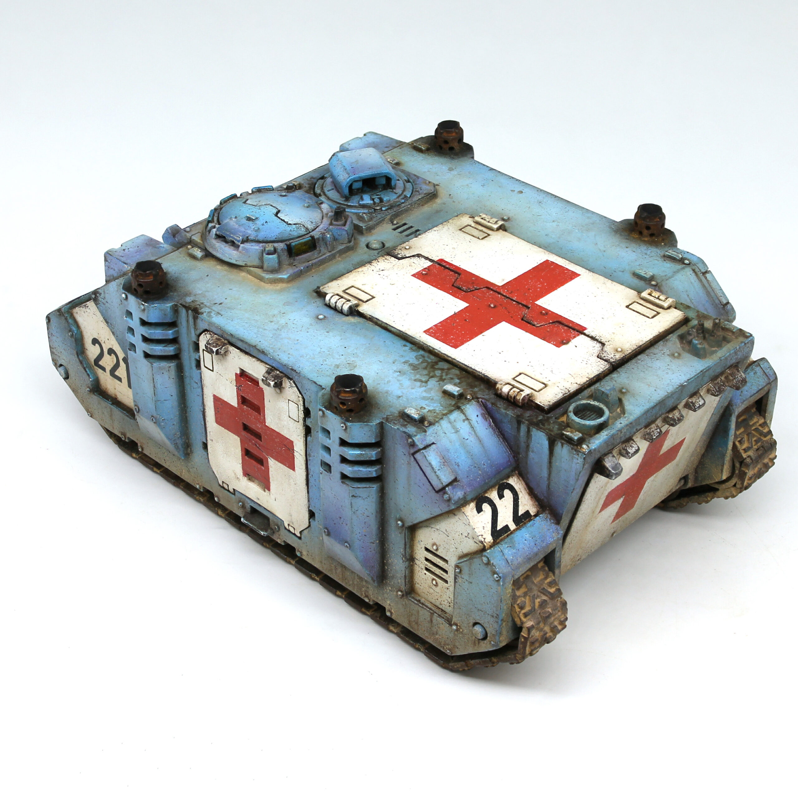 W40K Rhino APC finished as ambulance tank – scale model for W40K fans.